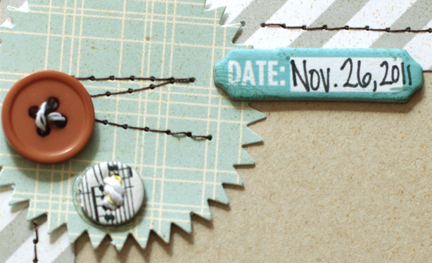 how about these closeups? Notice the little blue half circles? those are from the packaging from Elle's studio (I've always liked their packaging...)The other is here. It's a little harder to see....see the behind the Polaroid shape--the scallop thingy? That is from the button packaging, I just covered up the holes with the misted paper...